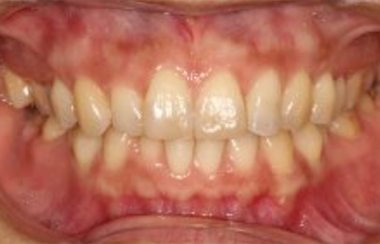 内側に倒れていた歯は適切な位置に移動し、左右差のある見え方が改善されました。上下顎ともに歯列が滑らかに整い、見た目の印象だけでなく清掃性も向上しています。現在は保定期間に入り、経過観察を行っています。 |