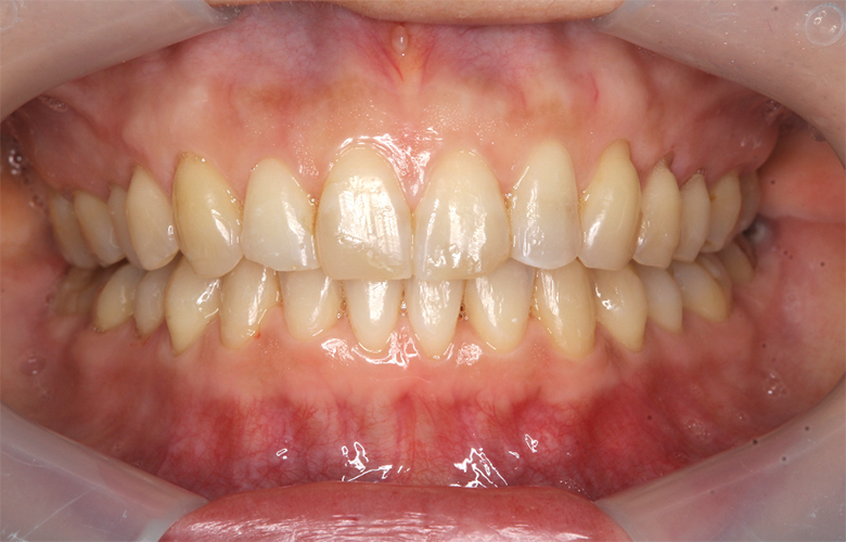 見た目に配慮し、できるだけ抜歯を避けたいとのご希望から、インビザラインによる非抜歯矯正をご提案しました。歯列アーチを整えながら、内側に倒れ込んでいた歯の位置を改善し、上下顎全体の歯列バランスを調整しました。アライナーは1日20時間以上の装着を指導しました。 |