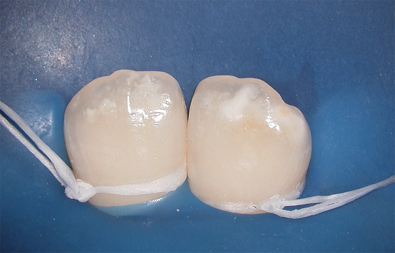 拝見したところ、エナメル質表層に限局したホワイトスポットが認められました。う蝕の進行はなく、歯質の保存が十分可能な状態であったため、削る治療ではなく低侵襲な審美的改善が適応と判断しました。