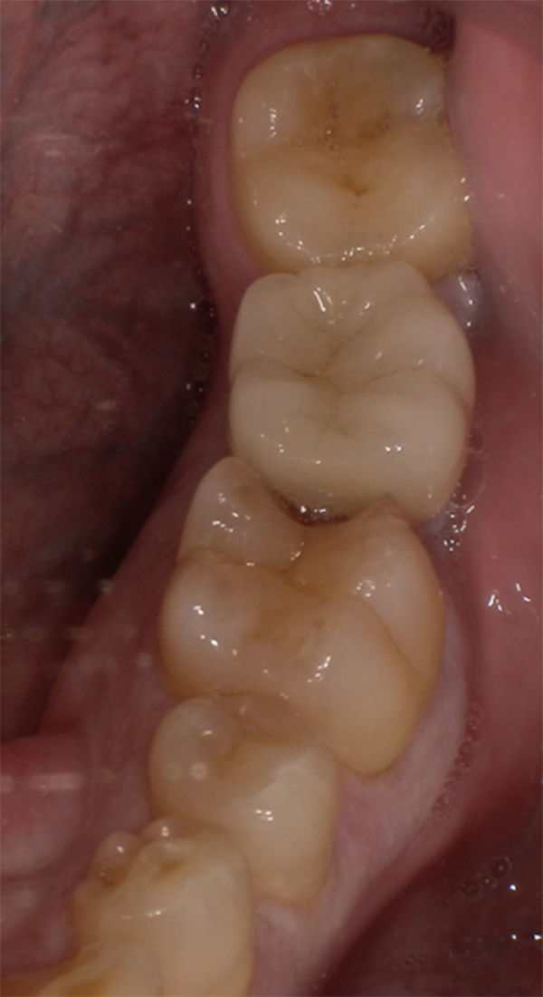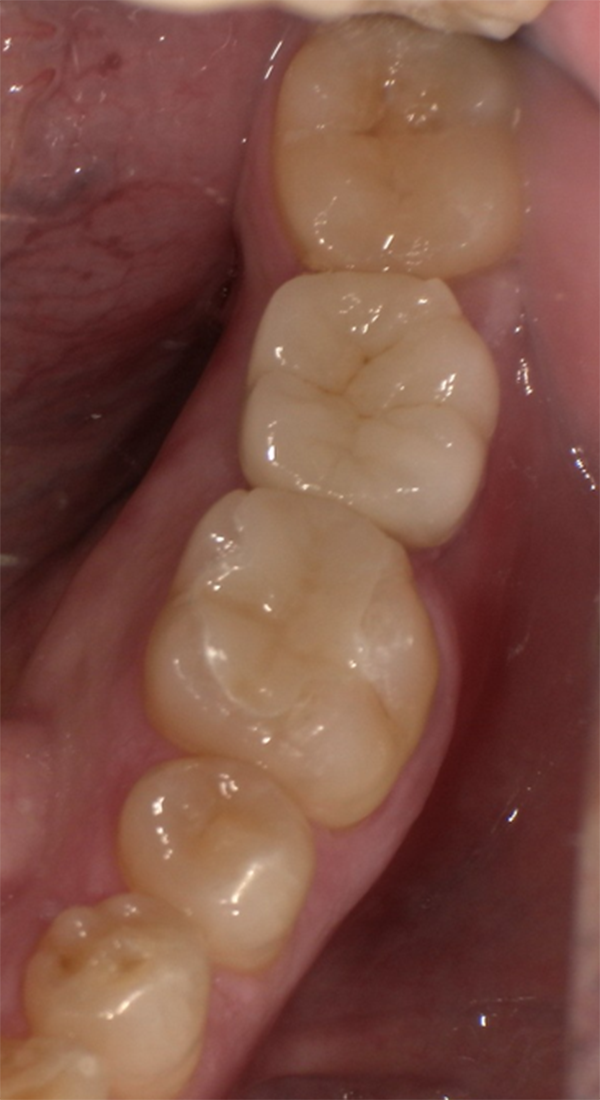 奥歯で噛んだ際の違和感があり、食事中に物が詰まるのと、痛みを感じることがあるとのことで来院されました。できるだけ長期的に安定する治療をご希望でした。 |