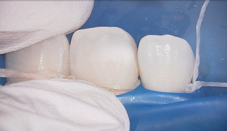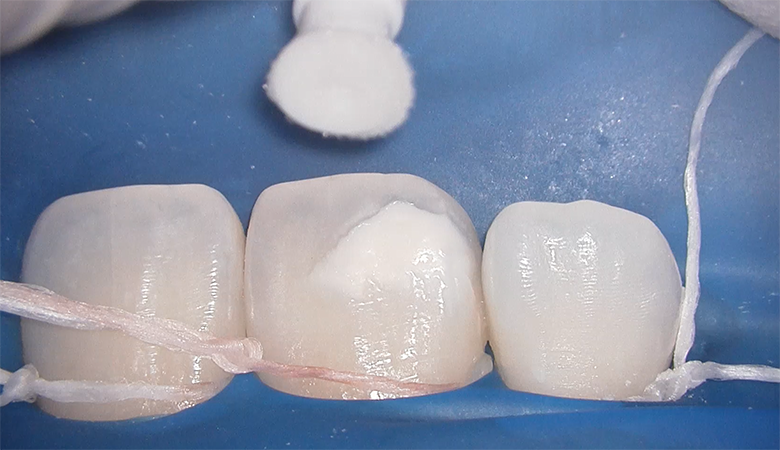歯を削る量を皆無にするため、レジン浸潤法(アイコン)をご提案しました。薬剤で表層を処理し、低粘度レジンを浸透させることで光の反射を改善し、白斑を目立ちにくくする方法です。短期間で審美改善が期待できる点から本法を選択しました。 |