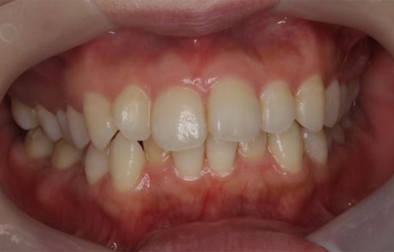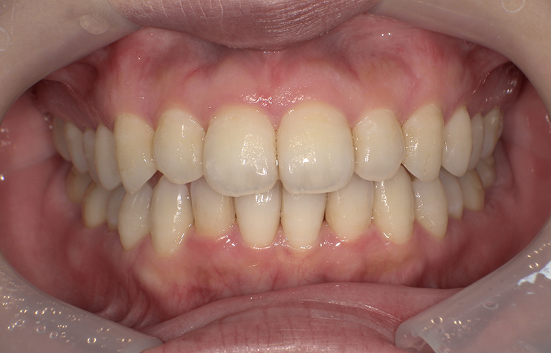 「前歯の重なりが気になり、人前で笑うのをためらってしまう。できるだけ目立たず短期間で整えたい」とのご相談で来院されました。